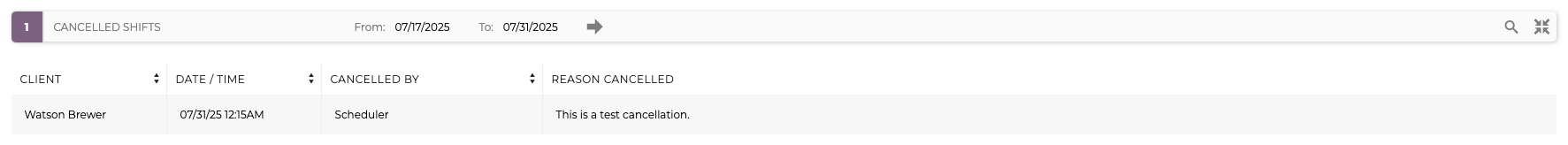 The cancelled shifts section can also filter by date, and keeps record of any shift the caregiver was assigned on the scheduling dashboard which was later cancelled.