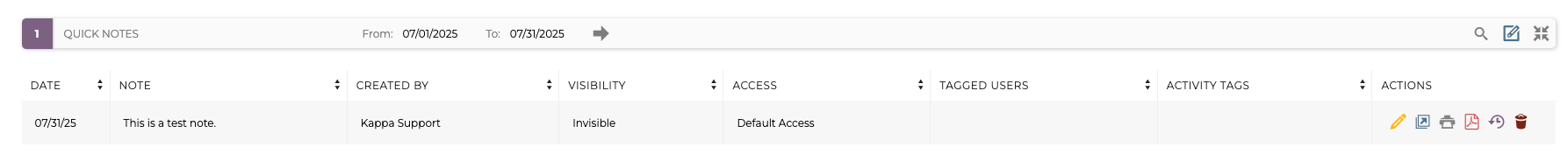The quick notes section holds quick notes entered for your caregivers. You can also adjust the start and end date ranges you wish to view notes for.