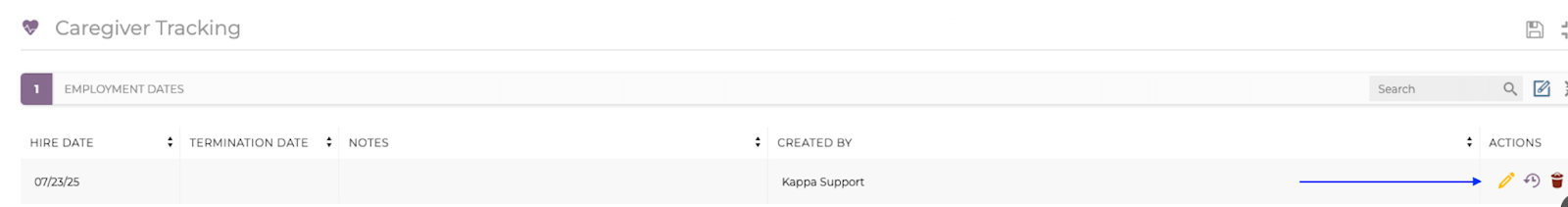 To update the Employment Dates, click the Caregivers section in the staff member's profile. Select the pencil to edit the current dates to include the termination (or deactivation date).
