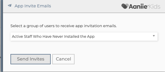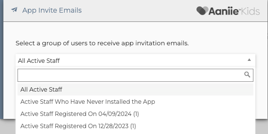 You can then select a group of users to receive app invitation emails: All Active Staff, Active Staff Who Have Never Installed the App, and by Registration Date(s)