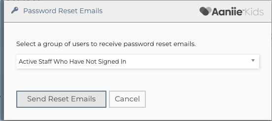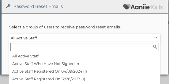 You can then select a group of users to receive password reset emails: All Active Staff, Active Staff Who Have Not Signed In, and by Registration Date(s)