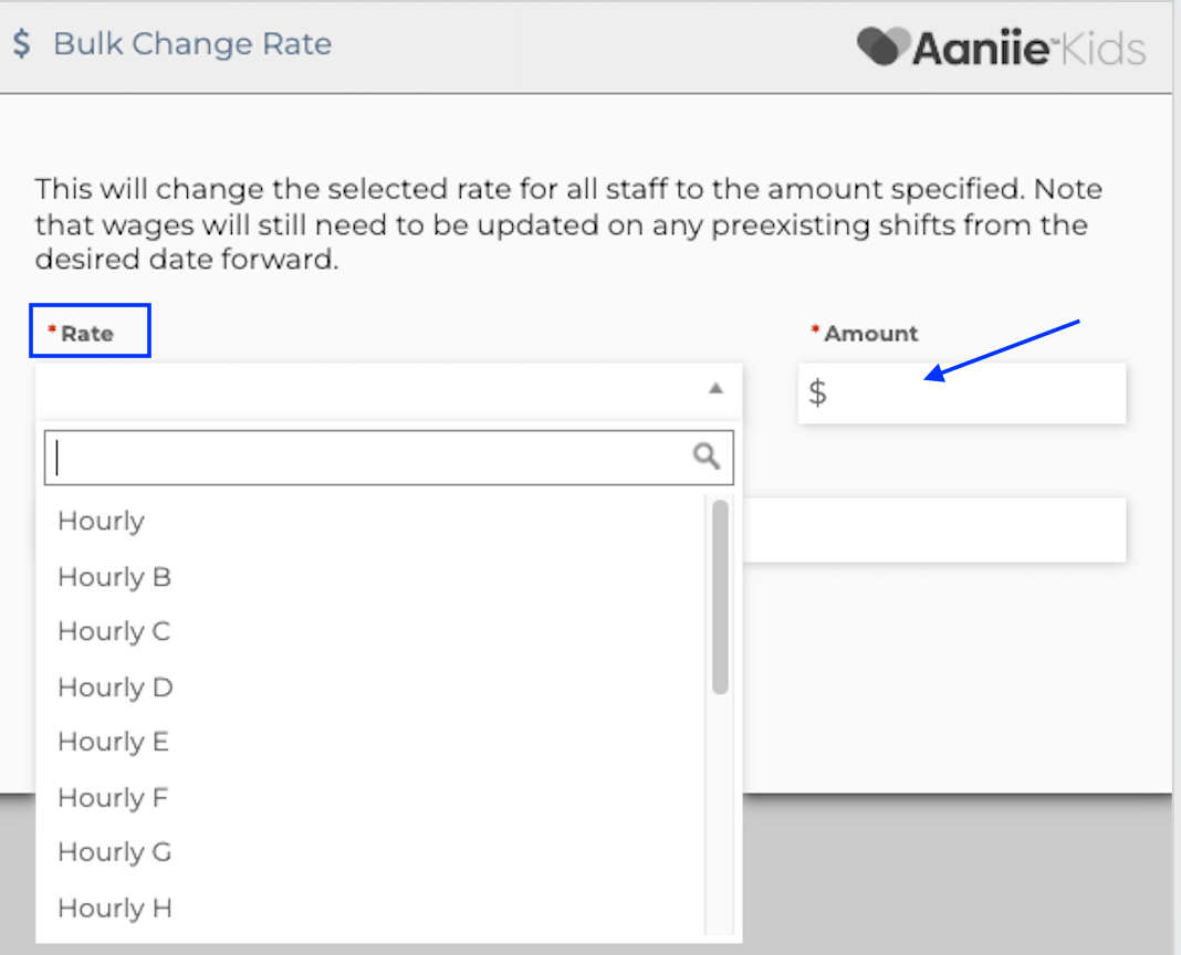 Once selected you can select the rate you would like to update in bulk across all staff. After selecting you would put the new wage amount in the Amount box.