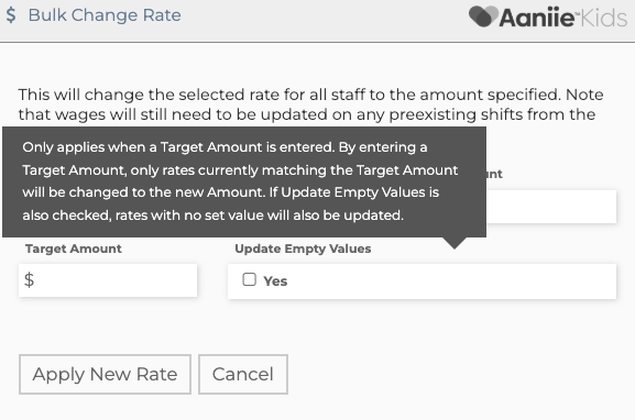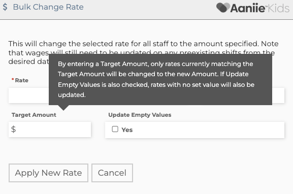 Next add a Target Amount (if applicable). A entered Target amount would only update rates selected that are that amount. If left blank ALL rates would change to the new amount selected.