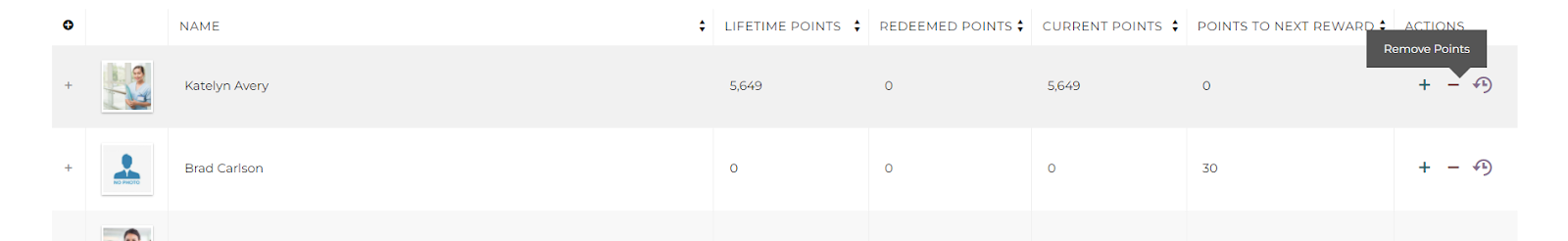 To view the entire history of any caregiver's reward points, click the View History icon to the right of the “+” and “-” icons.