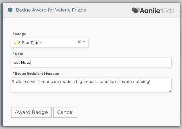 This opens a box that allows you to give the caregivers points, provide context for these points, and provide a note. All of these sections are required. Click Save when it is complete.
