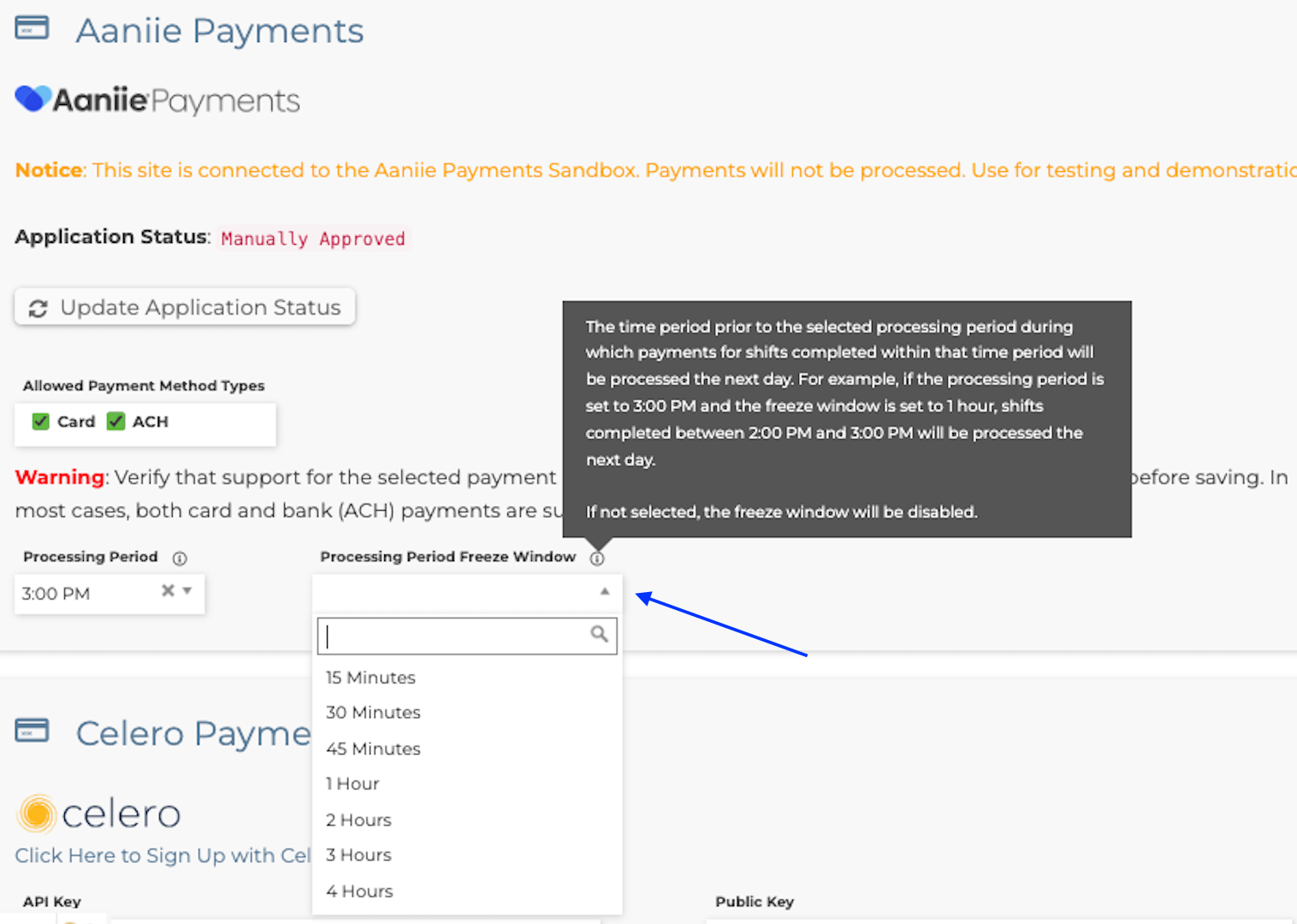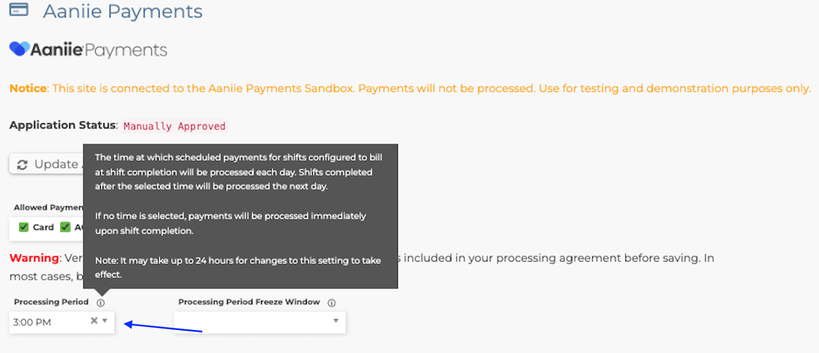 Processing Period Freeze Window - Amount of time you can select to have payments processed the next day to give you time to adjust punchcards if necessary. NOTE: see tool tip for complete definition.