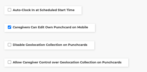 This setting allows automatic punching in for shifts at the designated shift start time. This ensures a punchcard is created for the caregiver at the time of the shift without having to log in to the app and clock in.