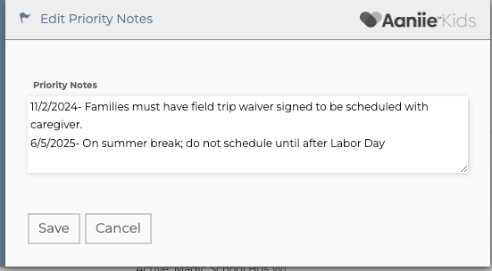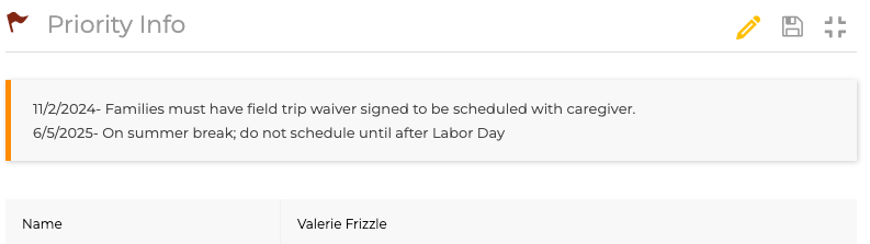 Admin Staff/Staff Managers have the option of entering notes into the Priority Information Notes section of each staff member.