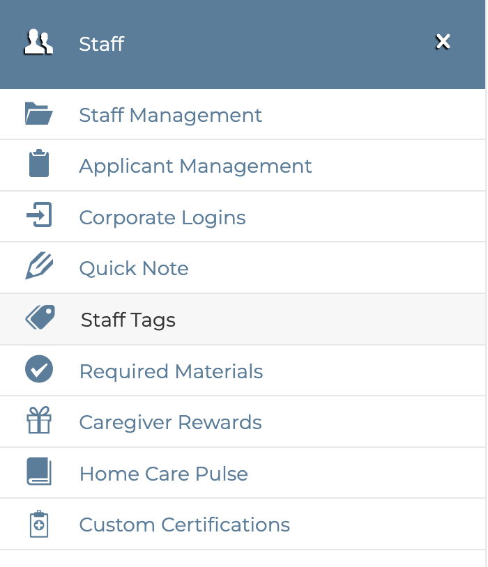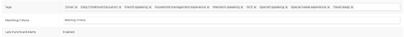 Tags can be used however fits your agency best. Examples of Staff Tags include: Language fluency (Spanish, Mandarin, etc), Experience Type (Driving, Early Childhood Education, Housekeeping, etc), or other services (Special needs, doula, multiples, etc). There is no “right” or “wrong” way to use Tags.